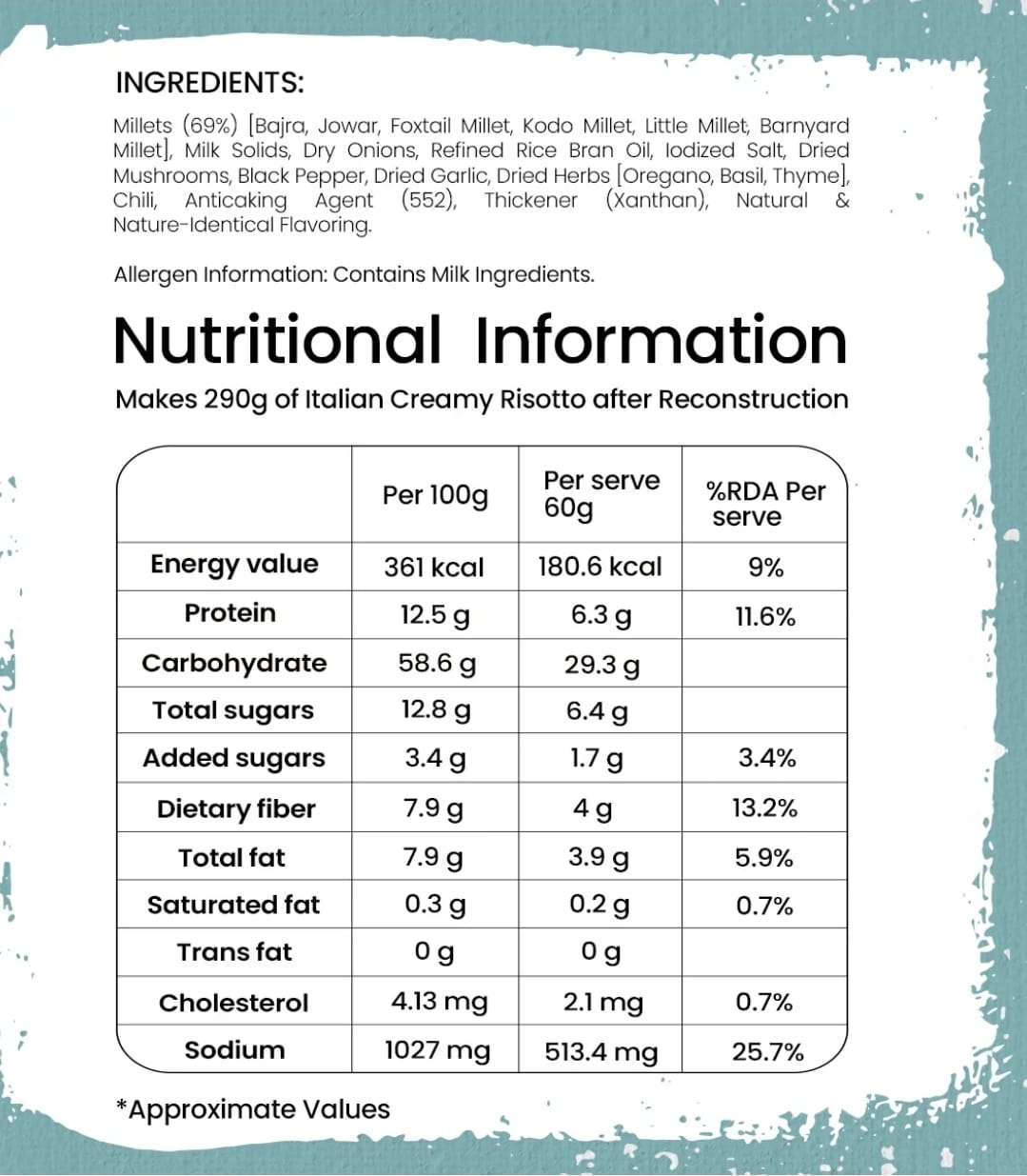 Enjoy a creamy, savory meal with our Italian-inspired Millet Risotto. Made with rich milk, vegetables, and millets, this dish is ideal for a quick, wholesome meal. USP Rich In Protein | Rich In Dietary Fibre | 69% Millets | Serves 1 Weight : 50g Cooked Portion Weight: 280g Packaging type : Single serve pillow pouch