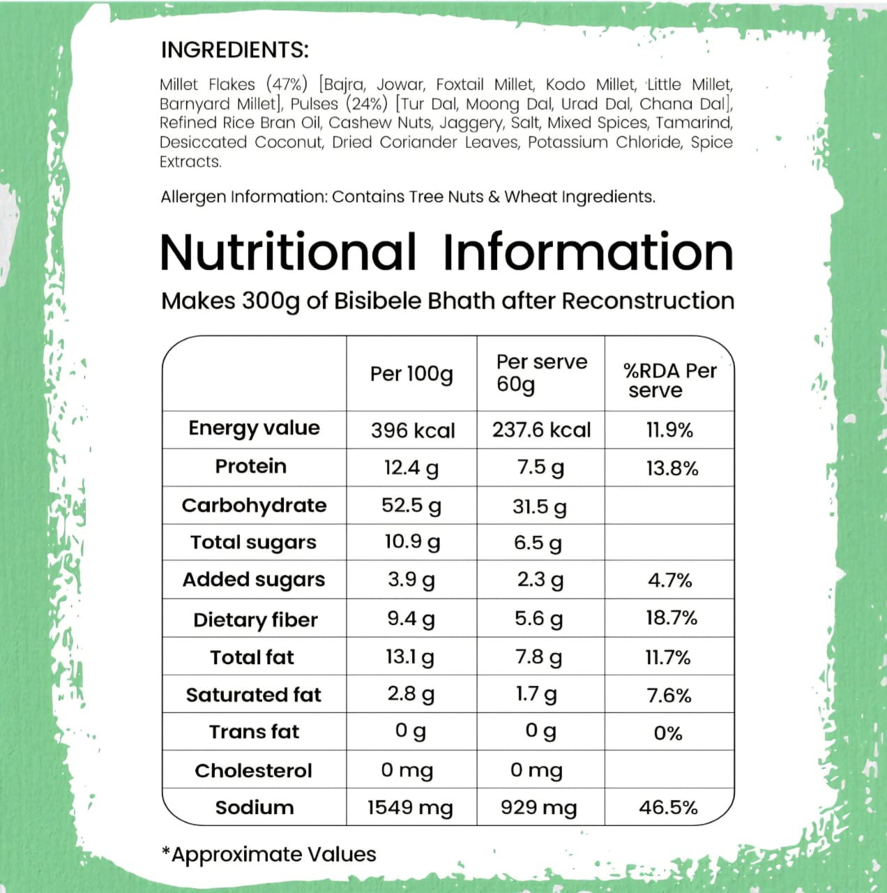 Bring the taste of Karnataka to your kitchen with this Bisibele Bhath, a flavorful mix of spices and wholesome ingredients. It’s a fulfilling dish that’s sure to satisfy your cravings! USP Rich In Protein | Rich In Dietary Fibre | 47% Millets & 24% Pulses | Serves 1 Packaging type : Single serve pillow pouch
